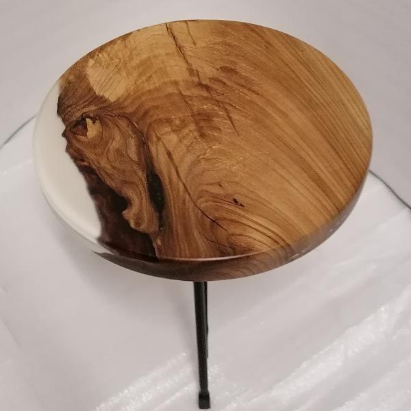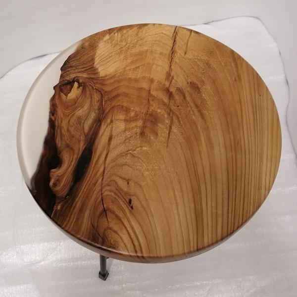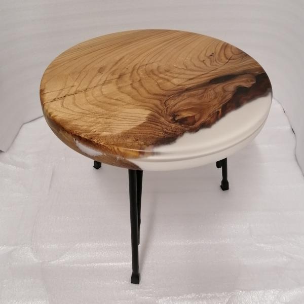 Preview: Couchtisch aus Massivholz und Kunstharz auf einem Metallgestell.