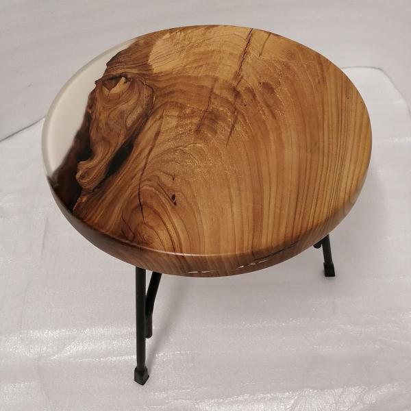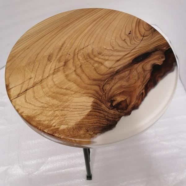 Couchtisch aus Massivholz und Kunstharz auf einem Metallgestell.
