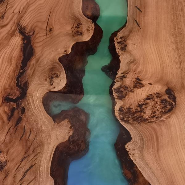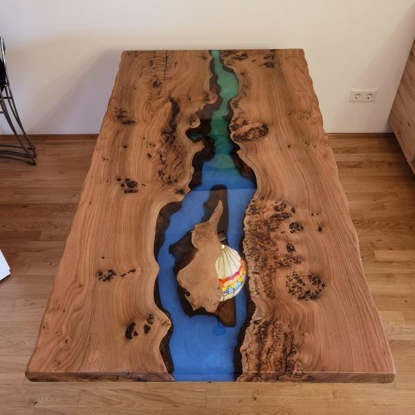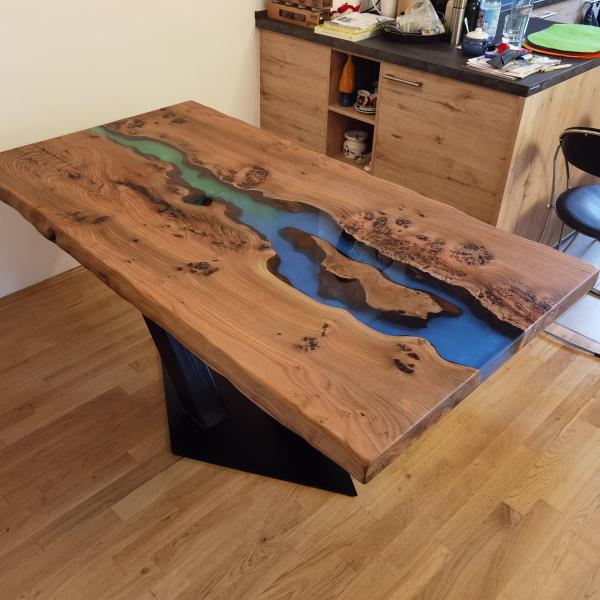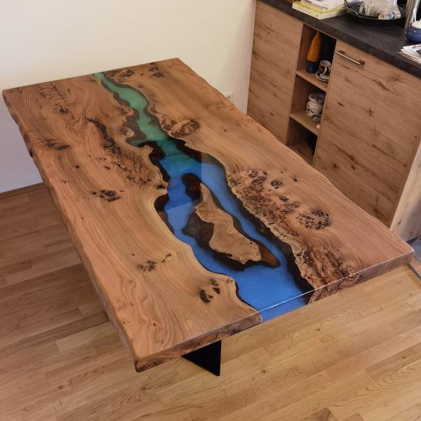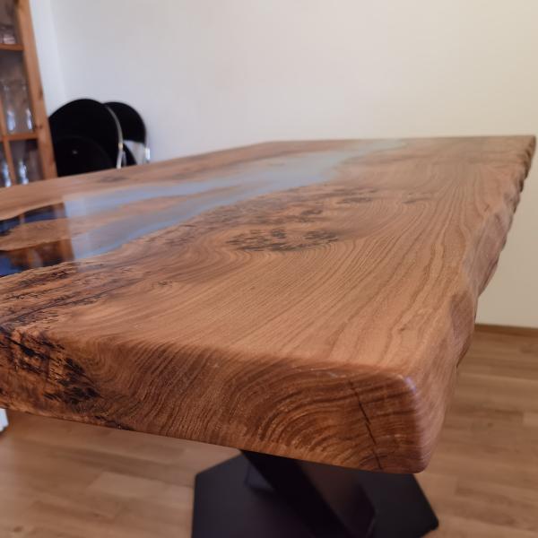 Ein wunderschöner Massivholztisch mit lebenden Kanten, schönem Kunstharzfluss  auf einem Metallgestell.