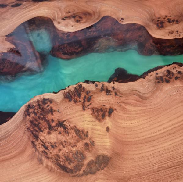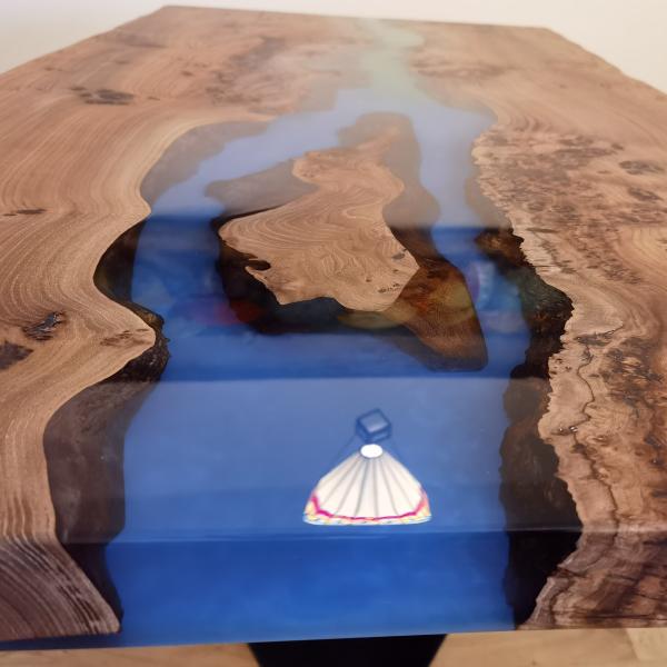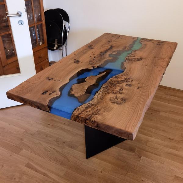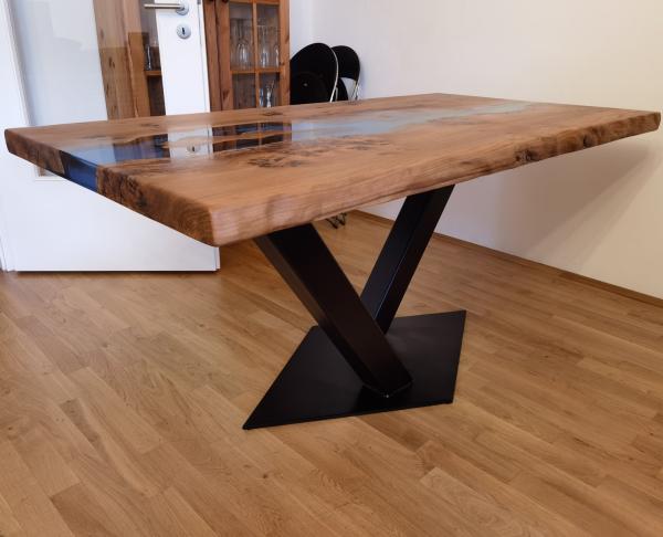 Preview: Ein wunderschöner Massivholztisch mit lebenden Kanten, schönem Kunstharzfluss  auf einem Metallgestell.