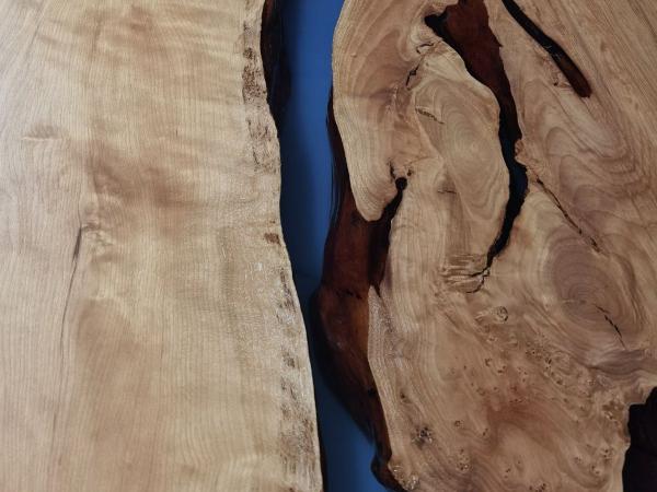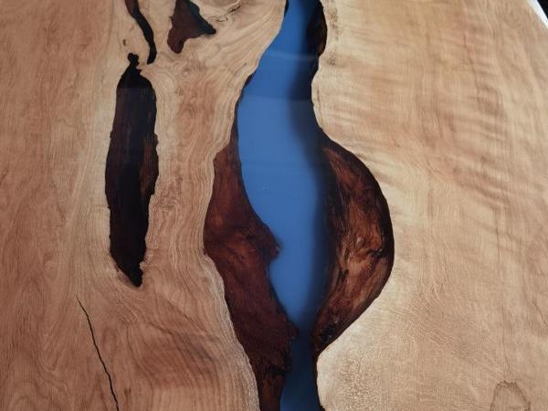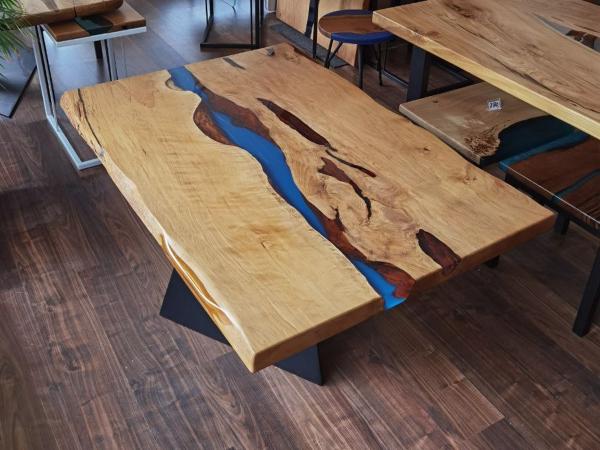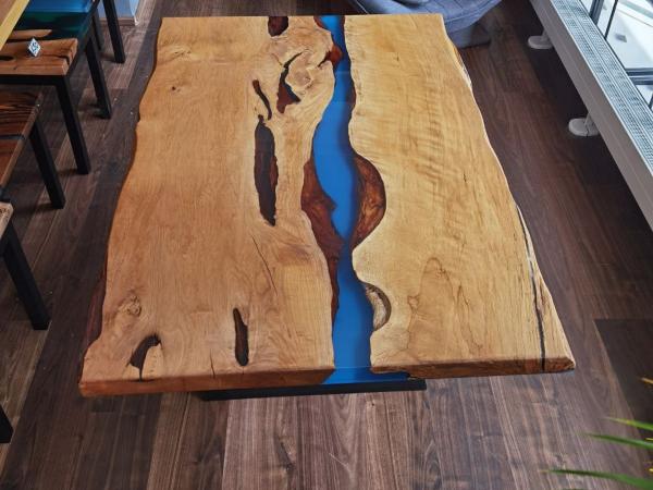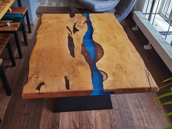 Ein Tisch aus Massivholz und Kunstharz auf einem Metallgestell.